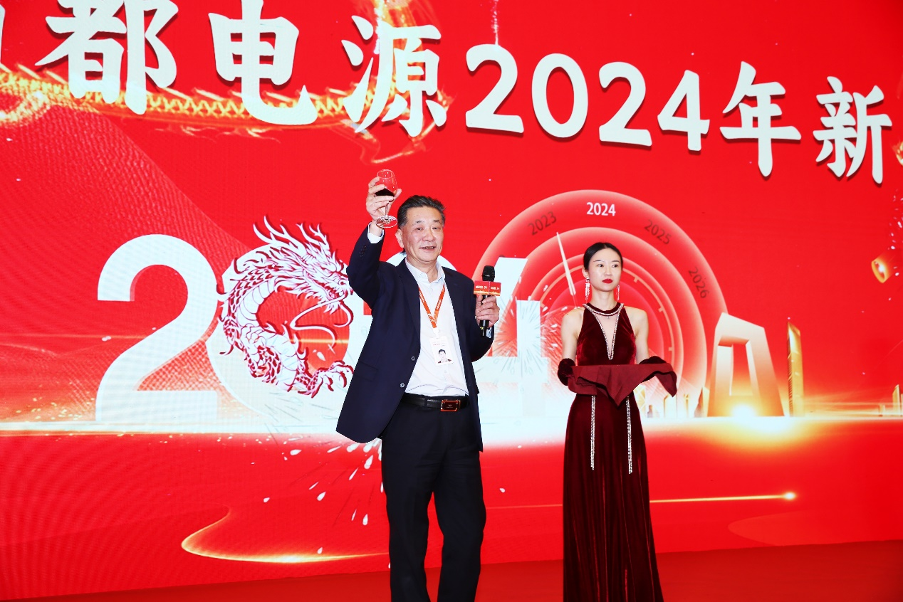 公司副董事长王岳能在晚会上致新春贺词。他感谢了全体南都人在2023年的辛勤付出。新的一年里,希望全体员工在朱保义董事长的带领下,凝心聚力、砥砺前行,全面完成2024年的各项指标,再创kaiyuan.开元(集团)智能科技股份有限公司网站,辉煌的30年!随后,王岳能副董事长在台上与全体员工共同举杯贺新春。